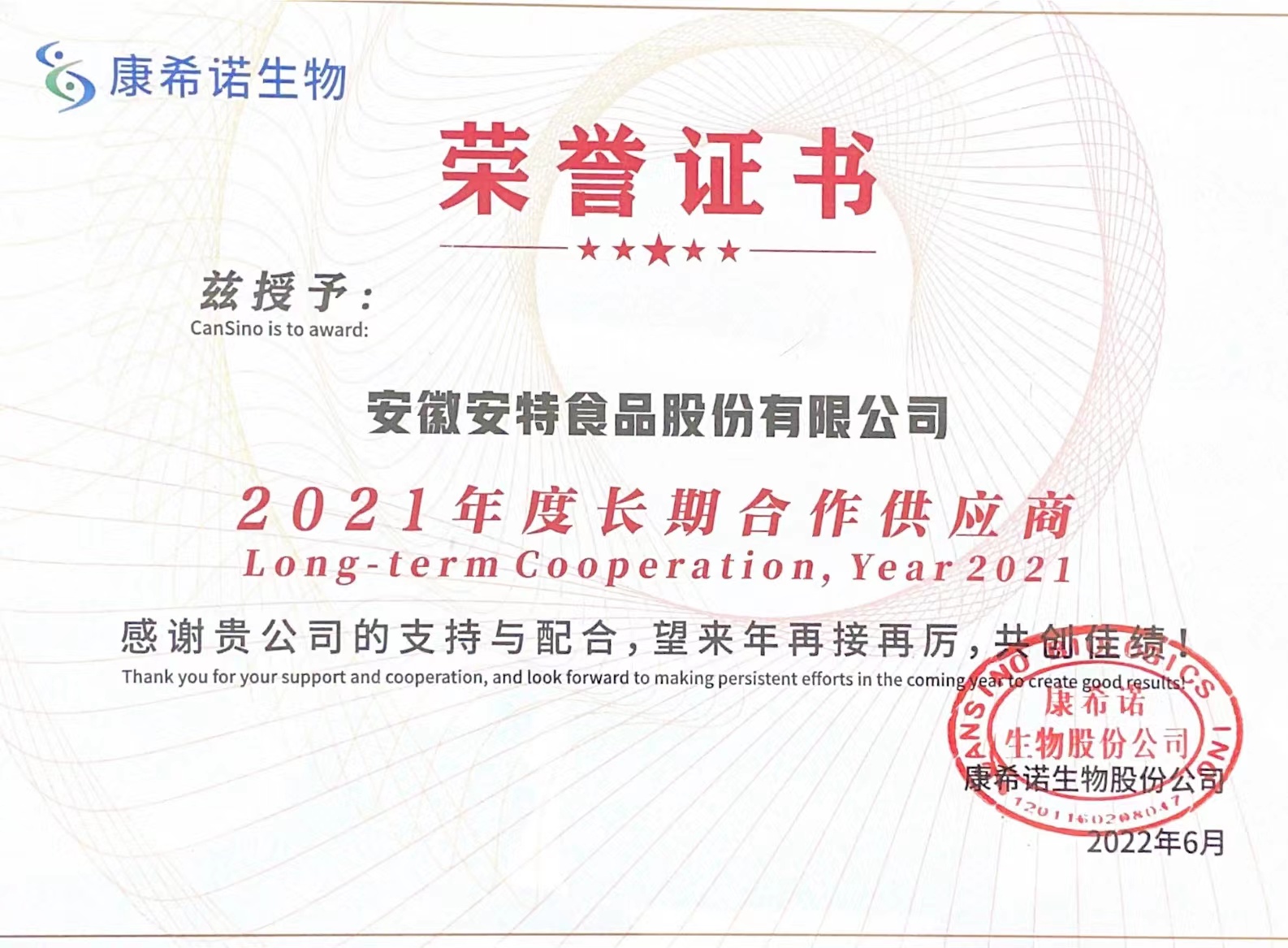 今天,我們收到一份康希諾生物頒發(fā)的榮譽(yù)證書(shū),授予我司“2021年付長(zhǎng)期合作供應(yīng)商”榮譽(yù)稱號(hào)。